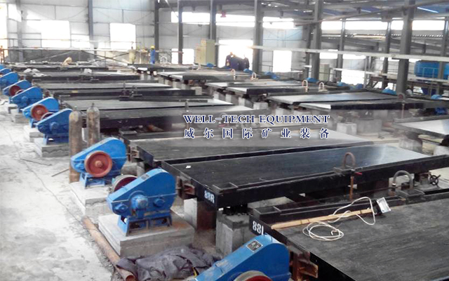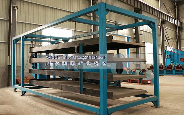 搖床有一個傾斜的床面,沿縱向在床面上釘有許多平行的來復條或刻有槽溝。搖床的一端裝有傳動機構,它帶動床面沿縱向做不對稱的往復搖動,床面橫向呈1.5度~5度向尾礦側傾斜,礦漿與沖洗水從床面坡度高的一側給入。這樣,礦粒在床面上就受到縱向搖動的床面與橫向水流的作用,使礦粒按密度和粒度分層并沿床面不同方向移動,呈現有規律的“扇形”分帶,并分別從床面的精礦端和尾礦側的不同區域排出床外,通過分別接取,從而被分成精礦、中礦和尾礦。