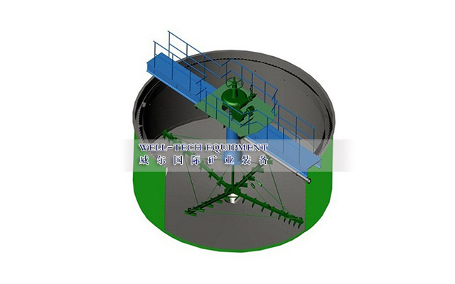 含固重為10%~20%的礦漿可通過濃密機(jī)重力沉降濃縮提升為含固量45%~55%的底流礦漿,再借助安裝于濃密機(jī)內(nèi)慢速運(yùn)轉(zhuǎn)(1/3~1/5r/min)的耙的作用,使增稠的底流礦漿由濃密機(jī)底部的底流口卸出。通過濃縮產(chǎn)生的澄清液(溢流),留在濃密機(jī)上部由頂部的環(huán)形溜槽排出。