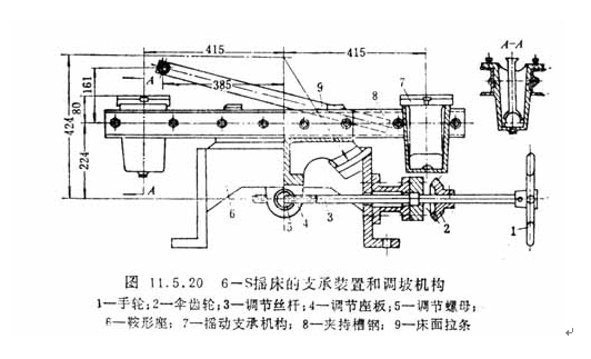 支承裝置和調(diào)坡機(jī)構(gòu)安裝在機(jī)架上,如圖11520所示。床面支撐在4塊板形搖動(dòng)桿上,可使床面運(yùn)動(dòng)呈一定的弧線,有助于床面上礦砂的運(yùn)搬。支撐桿的座槽用夾持槽鋼固定在調(diào)節(jié)座板上,后者再座落在鞍形座上。轉(zhuǎn)動(dòng)手輪,通過調(diào)節(jié)絲桿使調(diào)節(jié)座板在鞍形座上回轉(zhuǎn),即可調(diào)節(jié)床面傾角。這種調(diào)坡不影響床面拉桿的空間軸線位置,稱為定軸式調(diào)坡機(jī)構(gòu)。調(diào)坡范圍較大達(dá)0度~10度調(diào)坡后仍可保持床面運(yùn)行平穩(wěn)。 6-S搖床適合選別礦砂,但亦可選別礦泥。操作調(diào)節(jié)容易。