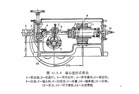 這種搖床又稱衡陽(yáng)式搖床,總體結(jié)構(gòu)見圖11·519。采用偏心連桿式床頭(見圖1159)。轉(zhuǎn)動(dòng)手輪,上下移動(dòng)滑塊4可以調(diào)節(jié)沖程。沖次則須借改變皮帶輪調(diào)節(jié)。操作中應(yīng)旋緊彈簧,不使肘板發(fā)生撞擊。