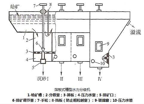 篩板式槽型水力分級機又稱典瓦(Denver)型水力分級機,是利用篩板造成干涉沉降條件的選礦設備。機體外形為一角錐形箱,箱內用垂直隔板分成4~8個分級室。每個室的斷面積為200mm×200mm。在距室底一定高度處設置篩板。