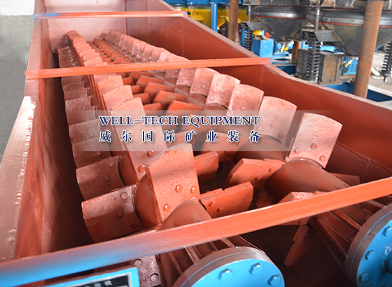 螺旋洗礦機(jī)用減速機(jī)帶動(dòng)兩個(gè)螺旋攪拌軸以不同方向旋轉(zhuǎn),進(jìn)入槽體的礦物經(jīng)葉片強(qiáng)力攪拌和清水沖洗,污水從槽尾溢流面排出,洗凈的礦物順著葉片傾角向上排出。