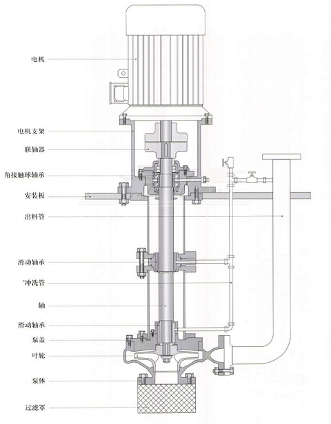 SP和SPR型泵為立式離心渣漿泵,浸入液下,用于輸送磨蝕性、粗顆粒、高濃度渣漿。不需要任何軸封和軸封水,在吸入量不足的工況下也能正常工作。